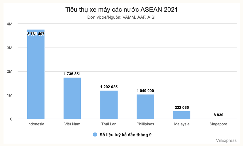 - Sau 3 quý đầu 2021, tiêu thụ xe máy mới ở Việt Nam đạt hơn 1,7 triệu chiếc, chỉ xếp sau Indonesia trong khu vực Đông Nam Á